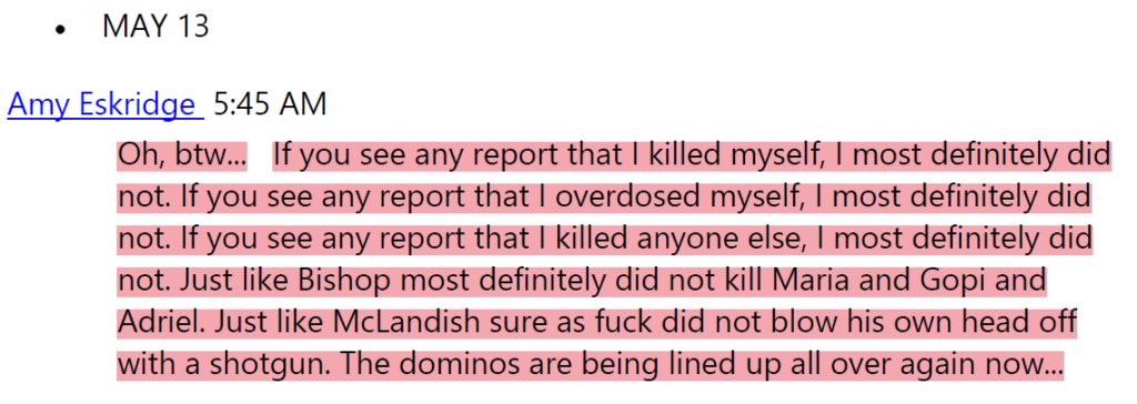 “Si ven algún informe que diga que me suicidé, les aseguro que no lo hice. Si ven algún informe que diga que sufrí una sobredosis, les aseguro que no lo hice. En caso de que vean algún informe que diga que maté a alguien más, les aseguro que no lo hice”.